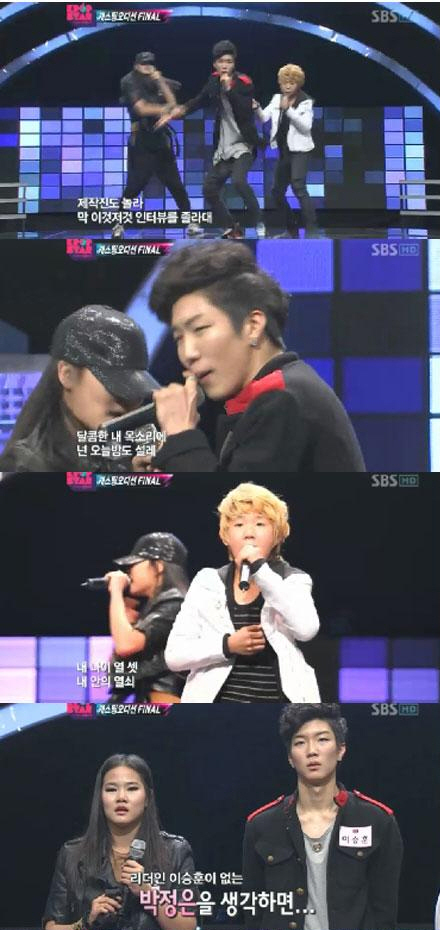이날 이승훈, 최래성, 박정은 조는 SM에서 트레이닝을 받은 후 자신들의 현재 심경을 담은 자작랩 '아무도 몰랐지'를 선보였다.