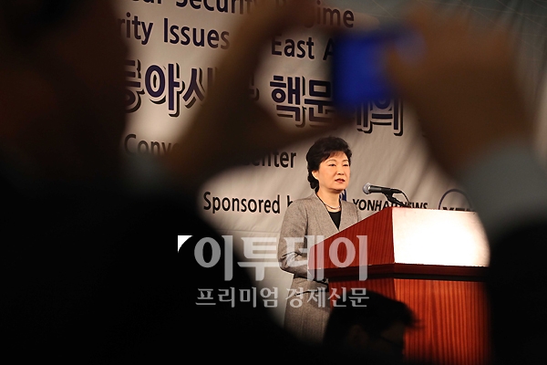 박근혜 새누리당 비상대책위원장이 28일 오전 서울 여의도 63컨벤션센터에서 열린 ‘글로벌 핵안보레짐의 형성과 동아시아 핵문제의 전망’ 국제학술회의에 참석해 기조연설을 하고 있다.