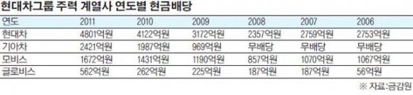 연도별로 보면 2004~2008년 현대차그룹의 상장사 배당총액은 4000~5000억원에 머물렀다. 기아차가 2006년부터 2008년까지 3년간 현금배당을 하지 않은 가운데 최대 계열사인 현대차도 매년 배당금이 3000억원을 밑돌았기 때문이다.