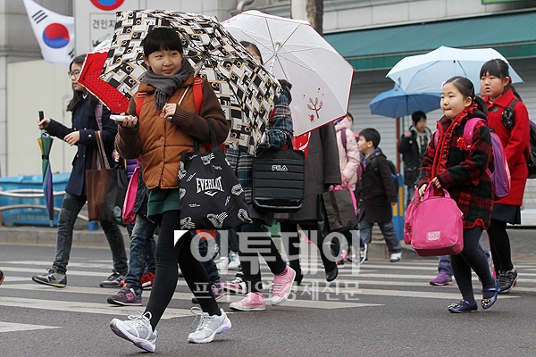 새학기를 맞은 2일 오전 서울 용산구 효창동 금양초등학교에서 학생들이 우산을 쓰고 첫 등교를 하고 있다.