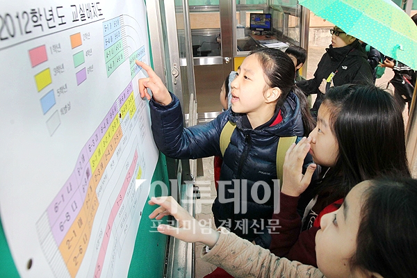새학기를 맞은 2일 오전 서울 용산구 효창동 금양초등학교에서 첫 등교한 학생들이 배정받은 반을 찾고 있다.