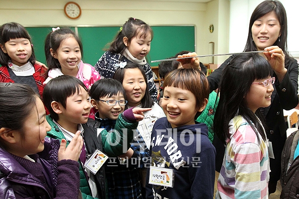 새학기를 맞은 2일 오전 서울 용산구 효창동 금양초등학교에서 학생들이 담임선생님과 키를 재며 즐거워 하고 있다.