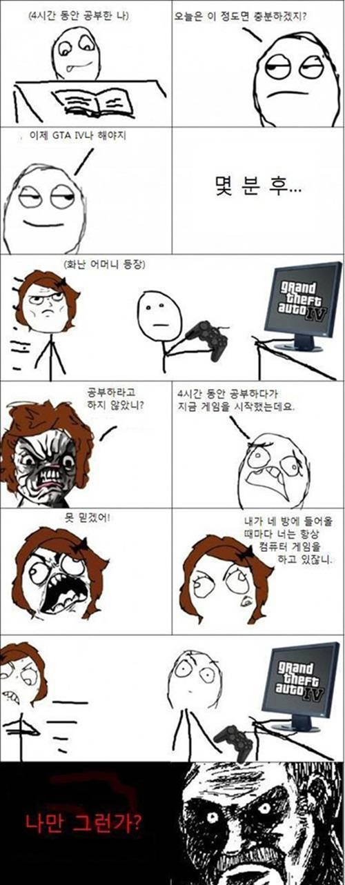 엄마는 "공부하라고 하지 않았니?"라며 혼을 내고 학생은 "저 4시간 동안 공부하고 지금 컴퓨터 켰는데요"라고 대답한다.