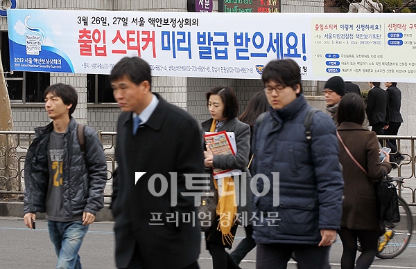 2012 핵안보정상회의가 열리는 26,27일은 인근도로가 통제될 예정이다. 핵안보정상회의를 20여일 앞둔 5일 오전 서울 삼성동 코엑스 앞 인도에는 통제되는 도로를 통과할때 필요한 출입스티커 발급을 알리는 현수막이 붙어있다.