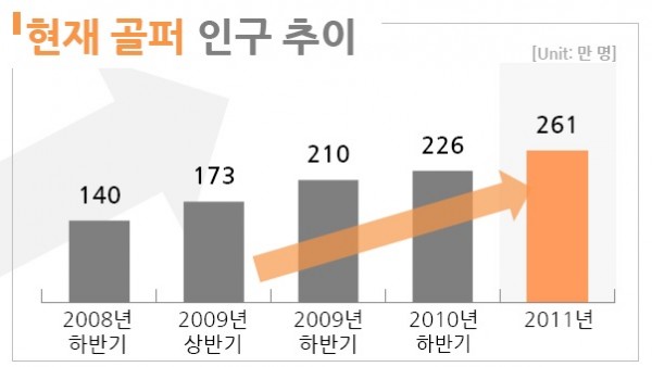 필드 인구는 2010년 125만명에서 2011년 128만명으로 소폭 증가에 그쳤고 실외 연습장의 경우 2010년 122만명에서 2011년 117만명으로 감소한 것으로 조사됐다.