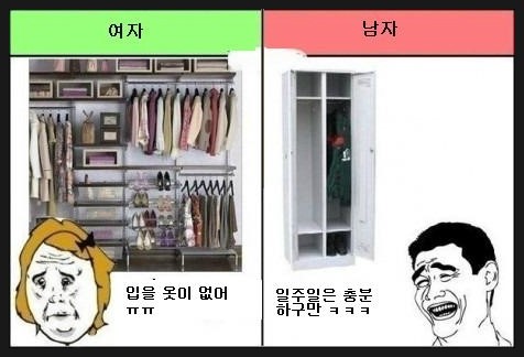 이를 접한 누리꾼들은 "여자는 저렇게 옷이 많아도 맘에 드는 옷이 없으면 옷이 없는거나 마찬가지" "여자와 남자의 차이…참 연구해봐도 정답은 없을 듯" "같은 사람인데 왜이렇게 다르지?" 등 반응을 보였다.