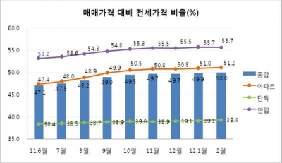 전국 종합 매매가격 대비 전세가격 비율도 오름세를 보이고 있다. 2월 기준 전국 종합 매매가격 대비 전세가격 비율은 56.6%다. 전국 종합 전세가 비율은 지난 해 6월 55%이었으며 지난 1월에는 56.4%였다.
