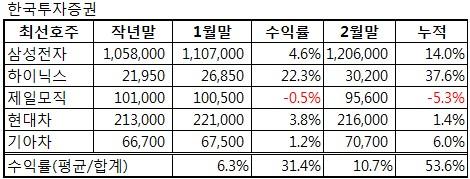 한국투자증권, 올 유망주 2월 누적수익률
