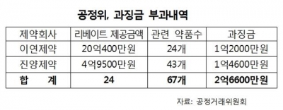 공정거래위원회는 6일 진양제약과 이연제약의 리베이트 제공행위에 대해 시정명령과 함께 과징금 각각 1억4600만원, 1억2000만원을 부과하기로 결정했다고 밝혔다.
