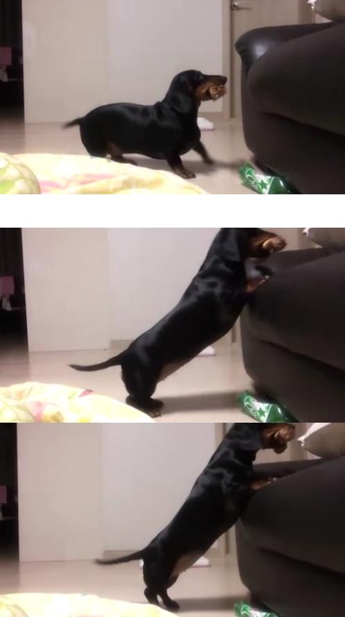 이 강아지는 입에 뼈다귀로 보이는 것을 문 채 쇼파위에 올라가기 위해 낑낑대는 모습이 애처로워 보일 지경이다.