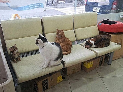 사진 속 고양이들은 애완견 센터로 보이는 장소에서 군대 내무반을 연상시키는 듯한 모습을 하고 있다.