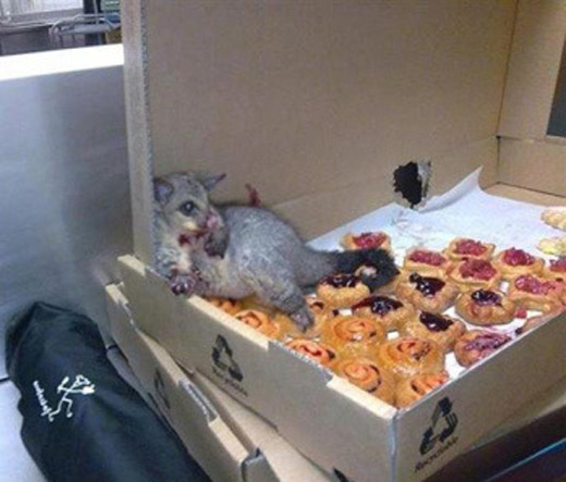 공개된 사진 속에는 주머니쥐가 한 제과점에 들어와 배부르게 빵을 먹은 뒤 행복한 표정으로 축 늘어져 있는 모습이 담겨있다.