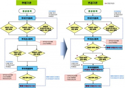특히 투자경고종목이 2일간 20%이상 상승할 경우 바로 1일간 매매거래정지 조치를 내릴 수 있는 제도가 신설됐다. 투자위험 종목지정에서도 투자경고 종목 지정 후 주가가 5일간 75%나 20일간 150% 이상 오른 경우에 발령됐으나 5일간 60%, 15일간 100% 이상 올라도 투자위험종목으로 지정하도록 했다. 또 투자위험종목 지정 당일과 거래재개 이후 3일 연속 상승시에도 1일간 거래정지 할 수 있도록 제도 개선했다.