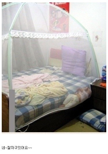 사진 속 침대에는 모기장이 설치돼 있다. 그런데 침대 위에는 아무도 없다. 자세히 보니 한 아기가 침대 바깥으로 떨어져 모기장에 몸을 걸친 채 다소 불편하다는 듯 웅크리고 잠들어 있다.