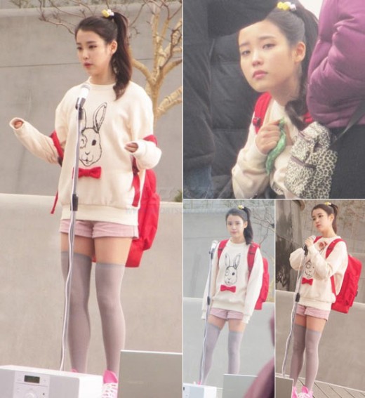 사진 속 아이유는 깜찍한 토끼 무늬와 빨간 리본 장식이 달린 티셔츠에 짧은 분홍색 핫팬츠를 입고 귀여운 매력을 뽐내고 있다. 특히 추운 날씨임에도 짧은 핫팬츠를 입고 늘씬한 각선미를 자랑하고 있다. 또 아이유는 여전히 앳되고 귀여운 모습으로 '국민 여동생'다운 모습을 보여 눈길을 끌었다.