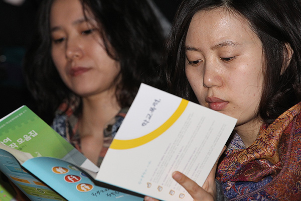 9일 오후 서울 KT광화문 지사에서 열린 학교폭력예방 전문강사요원 연수에서 참석자들이 브로셔를 살펴보고 있다.