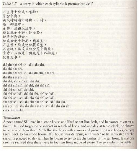 한시는 중국 시인이 쓴 시로 각각의 음절이 Shi(시)로 발음되는 한 이야기이다. 石, 詩, 十 등 다양한 한자가 적혀 있으나 발음은 성조만 다를 뿐 모두 Shi로 발음되고 있다. 뜻은 “’시’라는 이름의 시인이 돌로 만든 집에 살았다”이다.