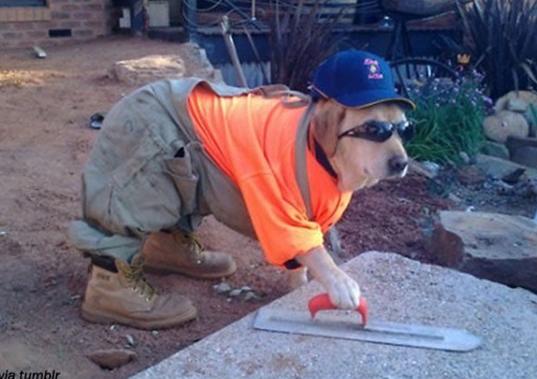 최근 인터넷 사이트를 통해 알려진 이 사진에는 모자, 선글라스를 쓰고 앞발에는 자를 들고 있는 강아지 모습이 담겨 있다. 사람같이 한손에는 흙손을 들고 작업화까지 완벽하게 착용한 모습에서 숙련공의 완벽한 자태가 뿜어져 나온다.