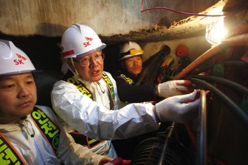 ▲박인식 SK브로드밴드 대표이사(가운데)가 마포구 성산동 소재 통신설비 맨홀 안에서 케이블 접속 상태 및 관리상태를 직접 점검하고 있다.(사진제공=SK브로드밴드)