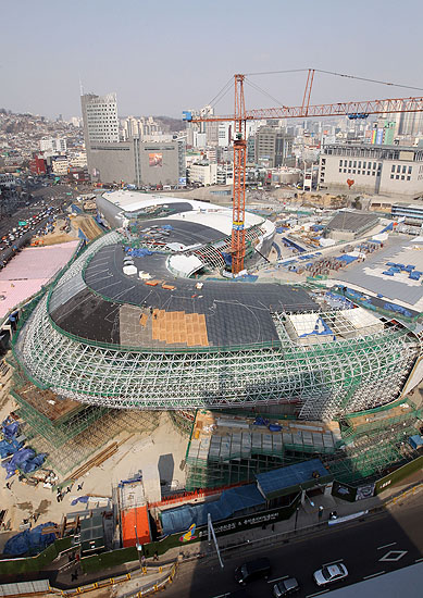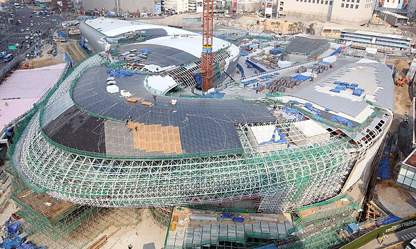 독특한 외형과 세계 최대 비정형 건축물로 주목받는 서울 동대문디자인플라자(DDP)가 2013년 7월 완공된다. 서울시는 현재 DDP의 외장 패널 4만5천여장의 58.3%인 2만6천여장을 설치했다고 13일 밝혔다. 옛 동대문운동장 자리에 들어서는 DDP는 이라크 출신의 세계적인 건축가 자하 하디드가 설계했으며 컨벤션홀과 전시관, 디자인정보센터, 지하연결 광장 등으로 구성된다.