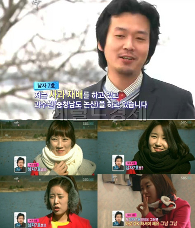 이날 방송에서 남자 7호는 "나이는 38세이고 과수원을 하고 있다"라고 말문을 열었다. 이어 "내가 처음에 친환경 농사를 시작했을 때 사과가 너무 형편없어서 공판장에 가면 판매를 할 수 없었다"면서 "차에 싣고 팔던 도중 농약 알레르기가 있던 한 임산부를 만났고 이 사과를 먹고 괜찮았다고 고마움을 표했다"란 일화를 밝혔다.