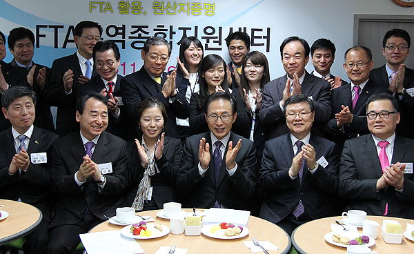 이명박 대통령이 15일 서울 삼성동 무역협회 내 FTA무역종합지원센터를 방문, FTA 지원 현황을 보고 받은 후 직원들과 박수를 치고 있다.