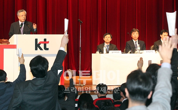 KT 제30기 정기주주총회가 16일 오전 서초구 우면동 KT연구개발센터에서 열렸다. 정기총회에 참석한 주주들이 이석채 KT 회장에게 발언권을 요구하고 있다.