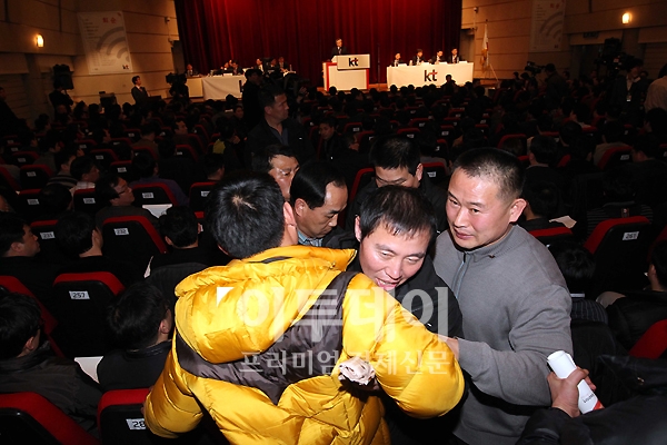 KT 제30기 정기주주총회가 16일 오전 서초구 우면동 KT연구개발센터에서 열렸다. 정기총회에 참석한 주주들과 KT 관계자들이 몸싸움을 벌이고 있다.