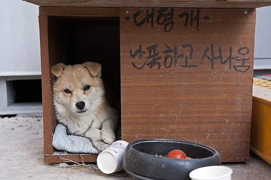 사진 속에는 '대형개 난폭하고 사나움'이라고 경고문구가 쓰여진 개집에 개 한 마리가 누워 바깥을 내다보고 있다. 그러나 씌어진 것과 달리 개는 그렇게 크거나 위협적일 만큼 사나워 보이지 않는다.