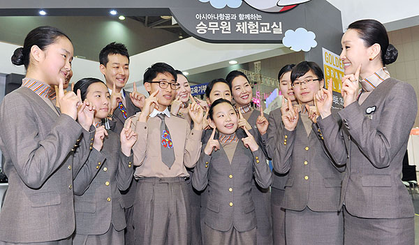 아시아나항공은 16일 일산 킨텍스에서 열린 '2012 대한민국 교육기부 박람회'에서 승무원 체험교실을 실시했다. 이날 행사에 참가한 학생들이 아시아나항공 유니폼을 입고 승무원(오른쪽)으로부터 미소 짓는 법을 배우고 있다.