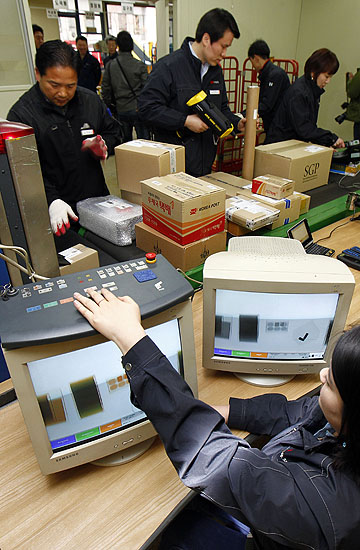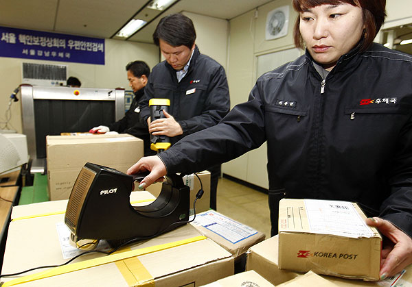 16일 오전 강남우체국 직원이 첨단장비를 이용해 우편물을 검색하고 있다. 강남우체국은 '2012 서울 핵 안보정상회의'와 관련해 주요인사와 시설로 보내지는 우편물을 X-Ray 투시기와 화학/방사능 탐지기를 사용해 우편물 검색을 강화하고 있다고 밝혔다