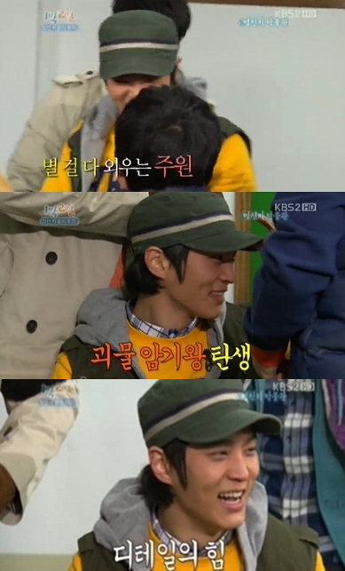 주원은 박물관에 있는 여자 교복에 달린 명찰의 이름을 묻는 문제에 "김영희"라고 답을 외치며 무사히 문제를 통과한 것. 이는 앞서 멤버들이 이름까지 외울 필요는 없을 거라며 그냥 지나치고 이름을 외우는 주원을 말리기도 했던 부분이라 더 웃음을 자아냈다.