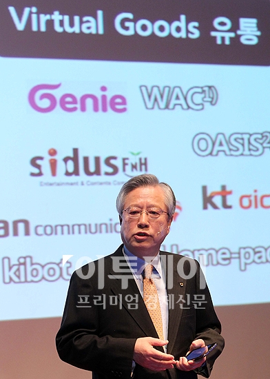 이석채 KT 회장은 19일 오전 서울 종로구 세종로 올레스퀘어에서 열린 ‘olleh 경영 2기 기자 간담회’에서 가상상품(콘텐츠·앱 등) 유통을 통해 글로벌 미디어 유통그룹으로 도약하겠다고 선언했다.