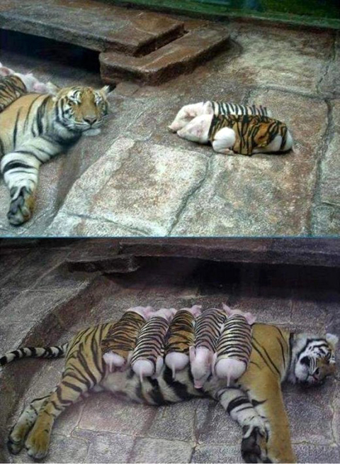 사진 속에는 새끼 돼지들이 호피 무늬 옷을 입고 호랑이의 젖을 물고 있다. 말그대로 '옷 벗는 순간 죽은 목숨'인 셈.