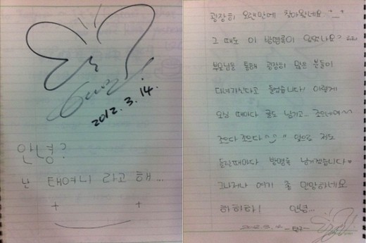 편지는 태연의 친필 사인과 함께 "굉장히 오랜만에 찾아왔네요"라는 문구로 시작한다. 이어 "부모님을 통해 굉장히 많은 팬들이 다녀가신다고 들었습니다. 이렇게 오실 때마다 글도 남기고 좋네요. 들를 때마다 방명록을 남기겠습니다"라는 팬들에게 감사의 마음을 전했다.