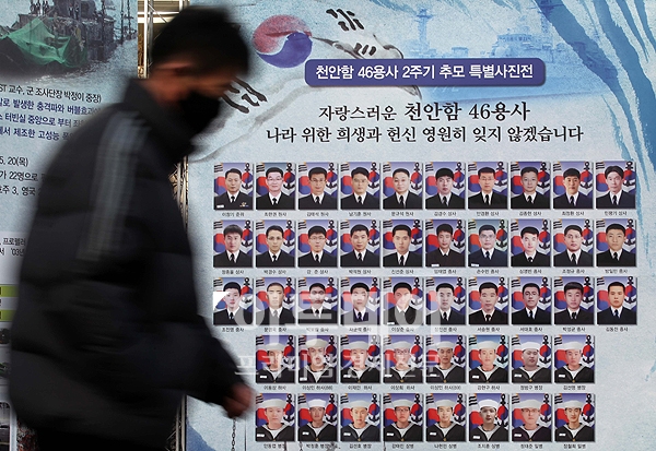 천안함 침몰 2주기를 5일 앞둔 21일 오전 서울역 시계탑 광장에서 시민이 ‘천안함 46용사 2주기 추모 특별사진전’을 관람하고 있다. 추모전은 오는 27일까지 계속되며 천안함 피격 상황 전개, 천안함 46용사 사진, 1주기 추모행사 등 관련 자료 60여점을 중심으로 펼쳐진다.