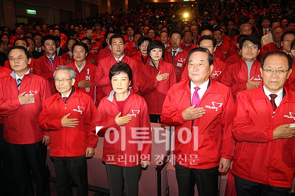 박근혜 새누리당 비상대책위원장과 선대위 지도부들이 21일 오전 국회 의원회관에서 열린 제19대 총선 중앙선대위 발대식 및 공천장 수여식에 참석해 국기에 대한 경례를 하고 있다.