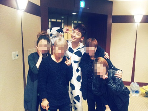 공개된 사진에서 이준기는 올인원의 젖소 무늬 옷을 입고 댄서들과 함께 어깨동무를 하고 있는 모습이다.