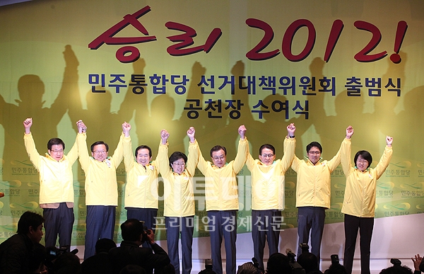 한명숙 민주통합당 대표와 선대위 지도부들이 21일 오후 여의도 중소기업중앙회에서 열린 선거대책위원회 출범식 및 공천장 수여식에 참석해 손을 맞잡고 있다.