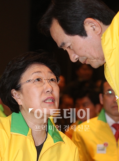 한명숙 민주통합당 대표(상임선대위원장)와 정세균 의원(특별선대위원장)이 21일 오후 여의도 중소기업중앙회에서 열린 선거대책위원회 출범식 및 공천장 수여식에 참석해 이야기를 나누고 있다.