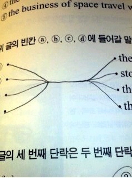 공개된 사진 속에는 영어 문제로 보이는 시험지가 담겨 있다. 문제는 "위 글의 빈칸 ⓐ,ⓑ,ⓒ,ⓓ에 들어갈 말은?"이라고 적혀 있는데 '무조건 정답' 게시자는 사진과 같이 각각 보기를 직선으로 연결한 것이 아닌 이어지는 부분을 한 선으로 표시해 각각의 보기가 어디로 연결되는지 구분짓기 힘들게 해놨다.