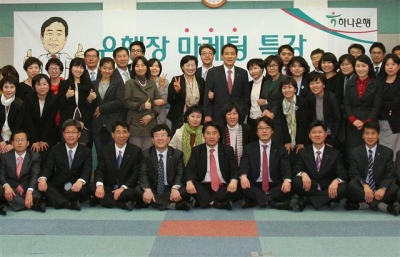 ▲하나은행은 김정태 행장이 지난 20일, 21일 이틀동안 임직원을 대상으로 실전 마케팅 특강을 열었다고 밝혔다. 사진은 특강 후 참가자들의 기념 촬영.
