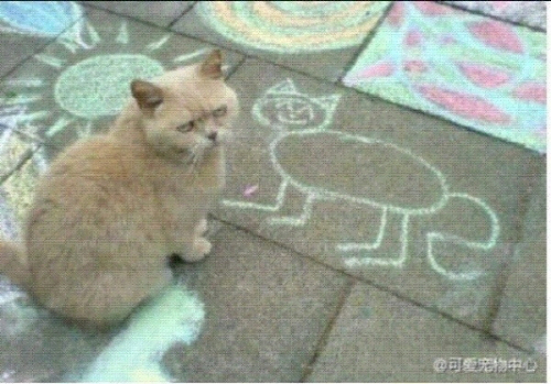 공개된 사진에는 고양이 한마리가 바닥에 그려진 고양이 그림을 보고는 위를 향해 노려보는 듯한 모습이다.