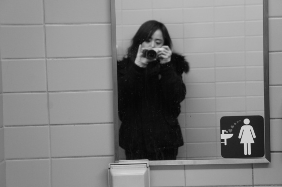 사진 속 문근영은 웨이브 진 단발머리에 사파리 점퍼를 입고 화장실 거울 앞에서 카메라를 꺼내들어 자신의 모습을 촬영하고 있다.