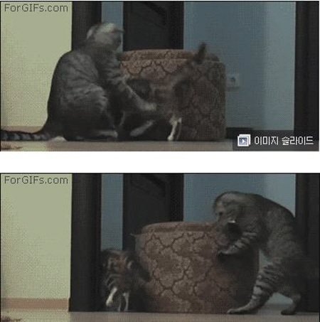 해당 동영상은 두 마리의 고양이가 공놀이를 하다 공이 구석으로 들어가자 한 마리의 고양이가 물건을 앞발로 밀어 공을 찾는 모습이 담겨 있다.