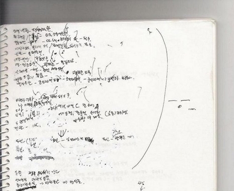 공개된 사진에는 졸면서 필기했다는 것을 여실히 보여주 듯 해독하기 어려운 필기내용과 지렁이와 비슷한 모양의 짧은 선들이 노트를 잔뜩 채우고 있다.
