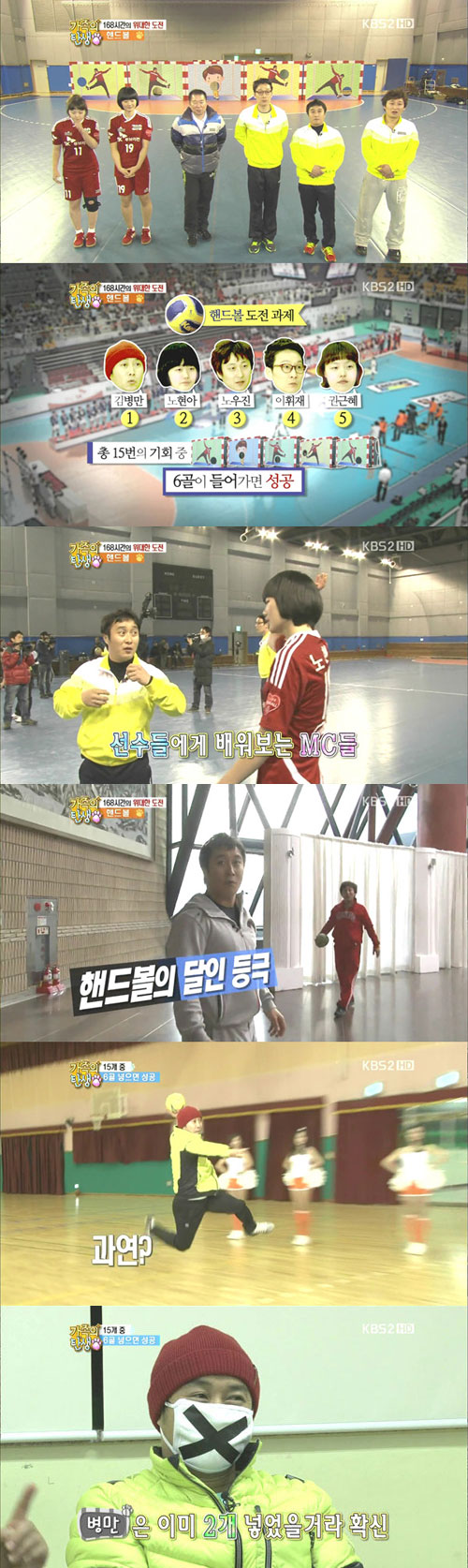 지난 24일 오후 방송된 KBS 2TV '자유선언 토요일 - 가족의 탄생'에서는 김병만을 포함한 세 MC들이 SK루브리컨츠 선수들과 함께 핸드볼 미션에 도전했다.