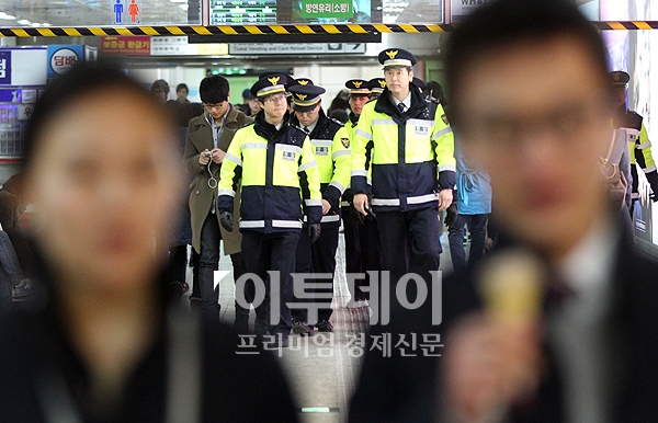 2012 서울 핵안보정상회의 개막을 하루 앞둔 25일 오후 경찰들이 서울 삼성역 안에서 삼엄한 순찰을 돌고 있다.
