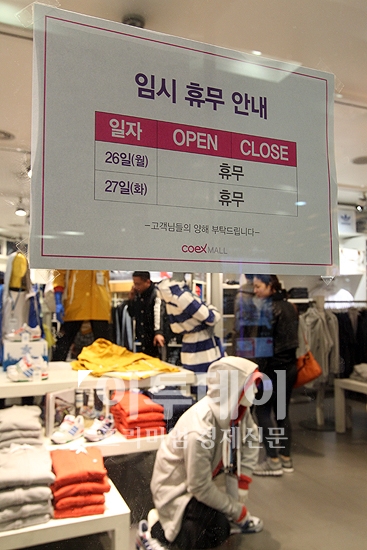 2012 서울 핵안보정상회의 개막을 하루 앞둔 25일 오후 서울 코엑스 상가에 26일부터 27일까지 핵안보정상회의 기간 동안 임시 휴무를 알리는 안내문이 붙어있다.