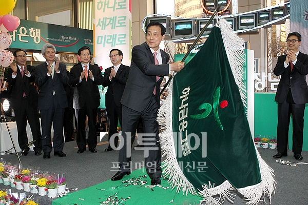 김정태 신임 하나금융지주 회장이 26일 서울 중구 소공동 하나은행 본점 로비에서 열린 취임식에 참석해 그룹기를 흔들고 있다.